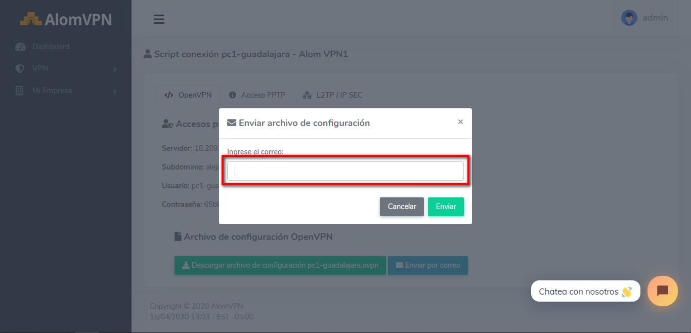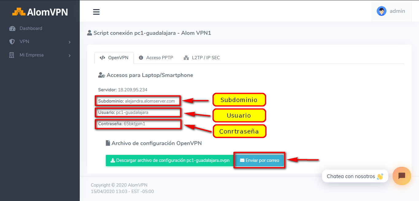 Envío de credenciales de usuario y archivo de configuración .ovpn.