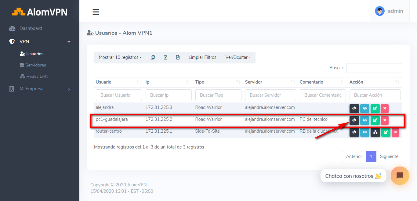 - Acceder al sistema y ubicar al usuario, VPN -> Usuarios, este tiene que ser de tipo Road Warrior.