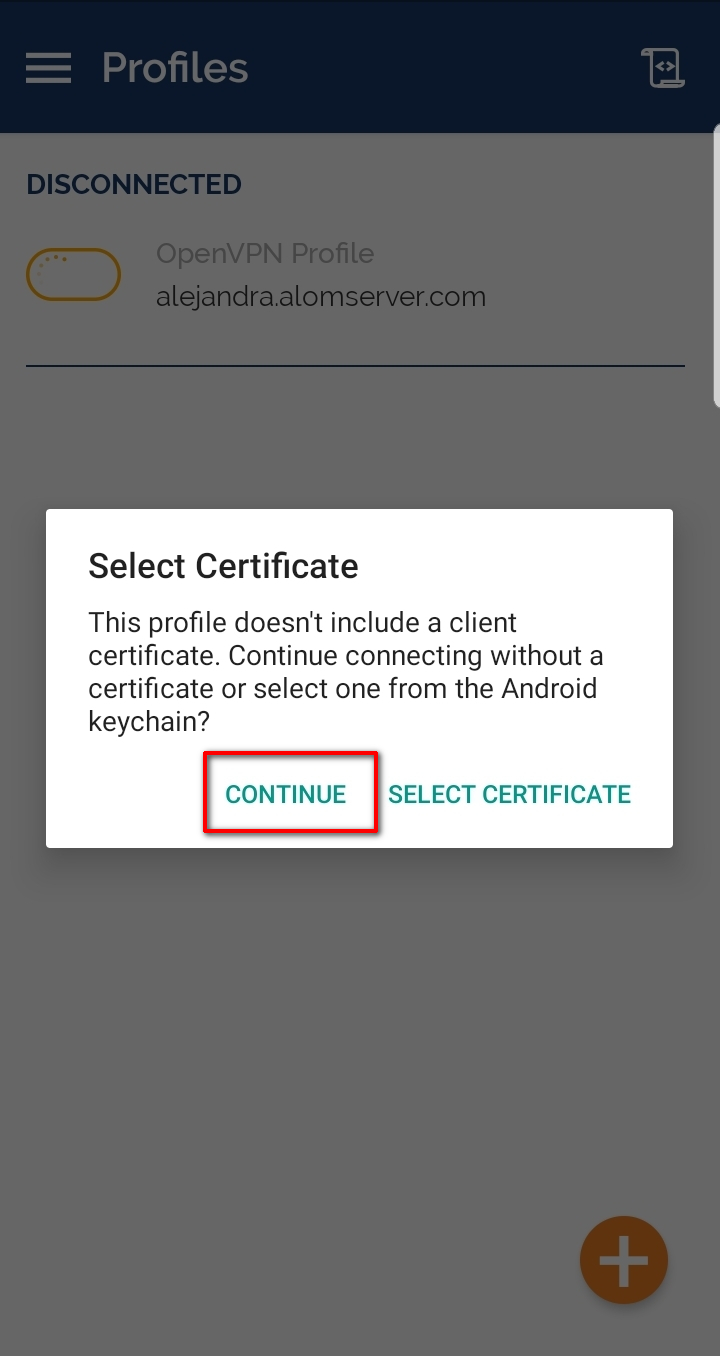 5 Una vez ingresada las credenciales de usuario, la aplicación nos preguntara si deseamos utilizar un certificado de autenticación, presionamos CONTINUE para omitirlo.