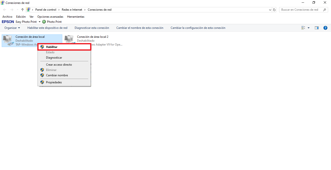 Una vez seleccionada, debemos hacer click derecho y seleccionar la opción habilitar.