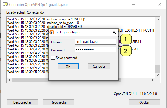 5 Ingresamos las credenciales de usuario (1) que nos fueron proporcionados y damos click en ok (2).