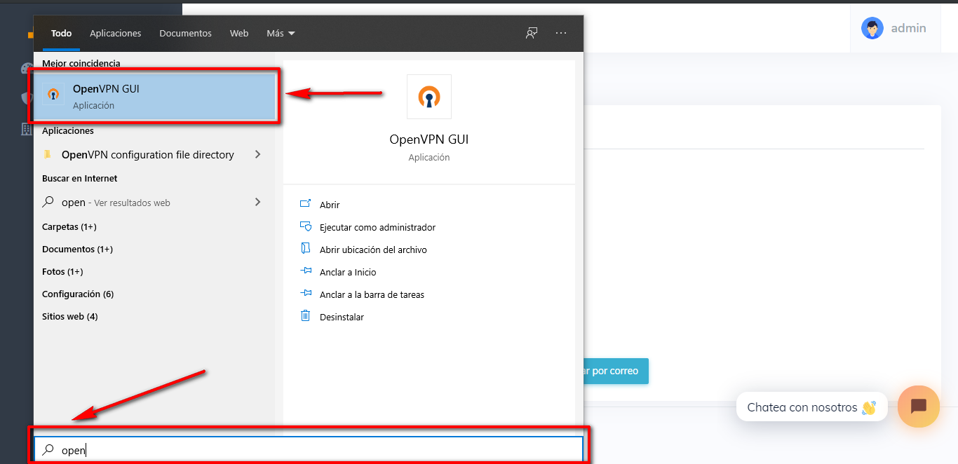 1 Para agregar una conexión VPN demos inicializar el cliente OpenVpn, para ello debemos ir al buscador de Windows e ingresar la palabra open y daremos click al resultado OpenVpn GUI.