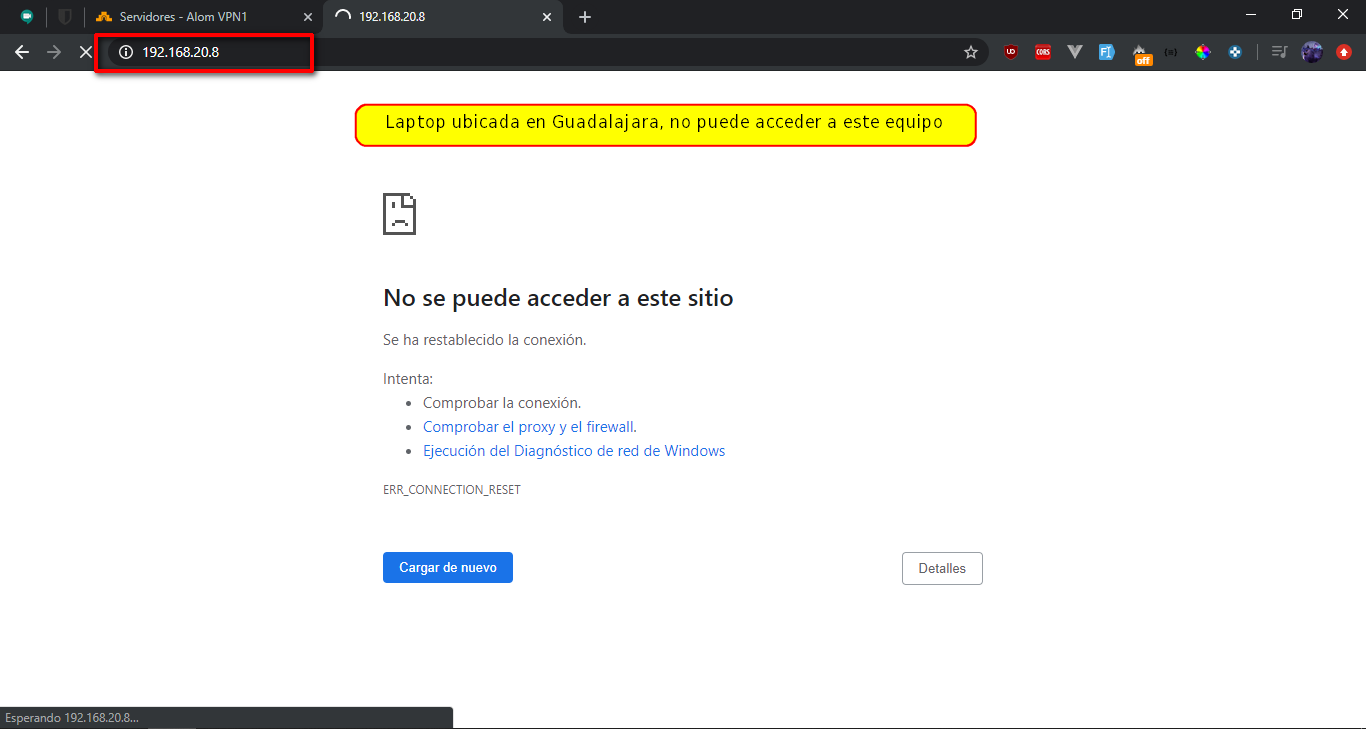 Teniendo un usuario de tipo Road Warrior (pc1-guadalajara) el objetivo sera acceder a la sectorial 192.168.20.8 que pertenece al Router Centro MX a través de una computadora debido a que si se intenta acceder sin configurar la VPN, sera imposible acceder.