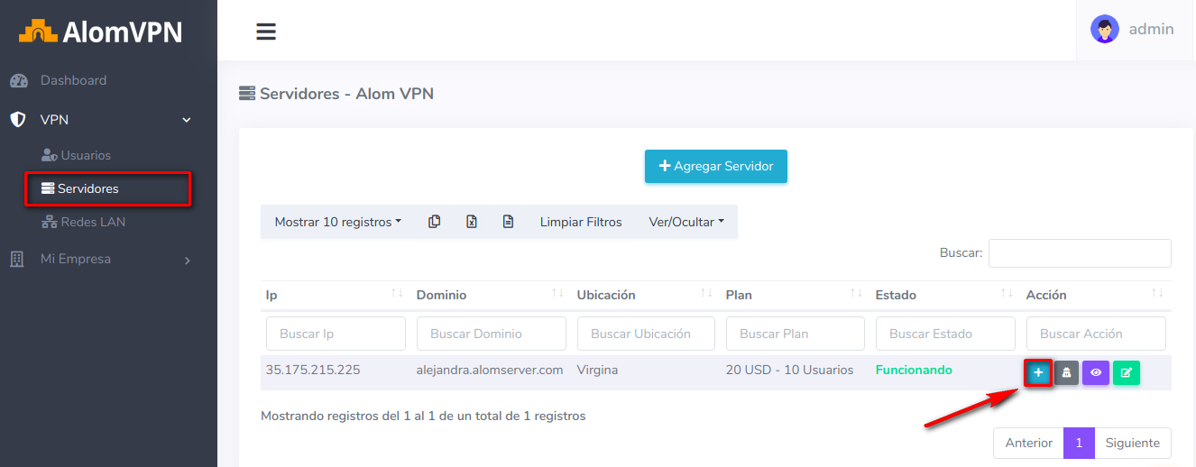 1 Para agregar un usuario RoadWarrior, acceda al apartado de Servidores y de click en el botón Agregar Usuario