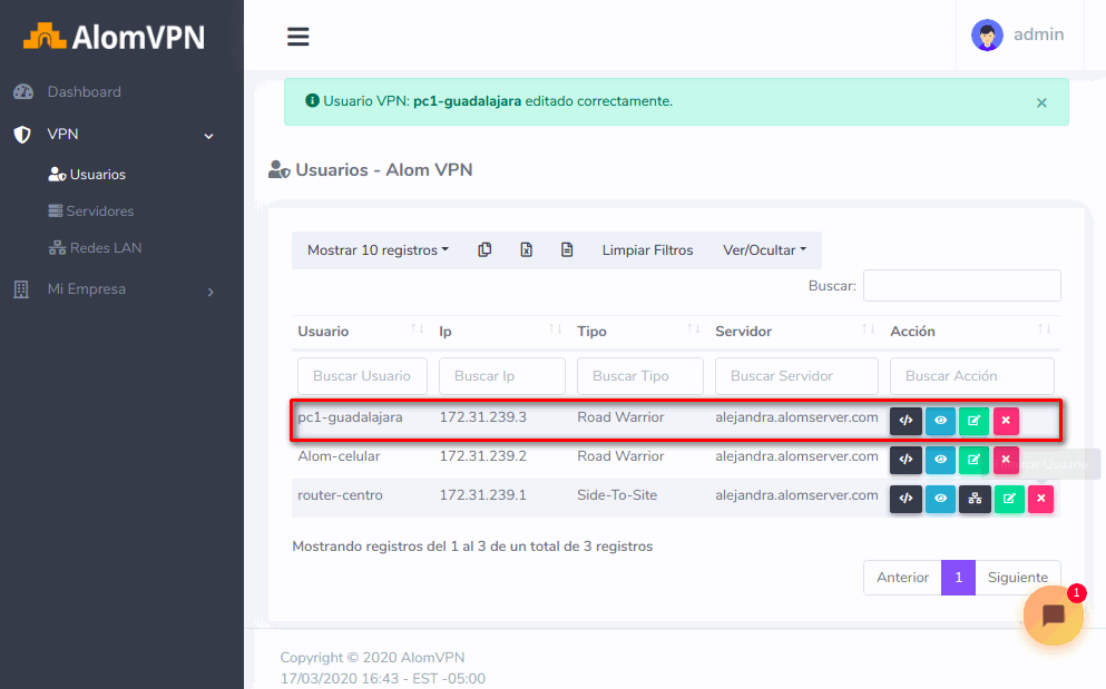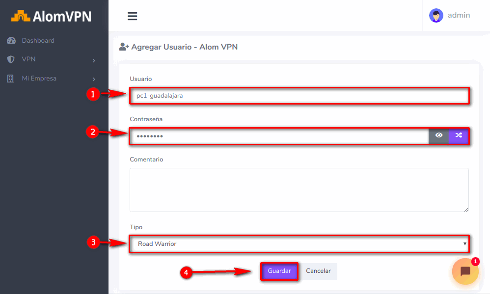 Los usuarios del tipo RoadWarrior (Laptop, Smartphone) son los que permitirán, por medio de la red VPN, acceder a los equipos del tipo Site-to-Site (Routers). En este caso tengo un computadora que se localiza en Guadalajara y quiere conectarse al Router Centro MX, para eso debemos agregar un usuario en AlomVPN