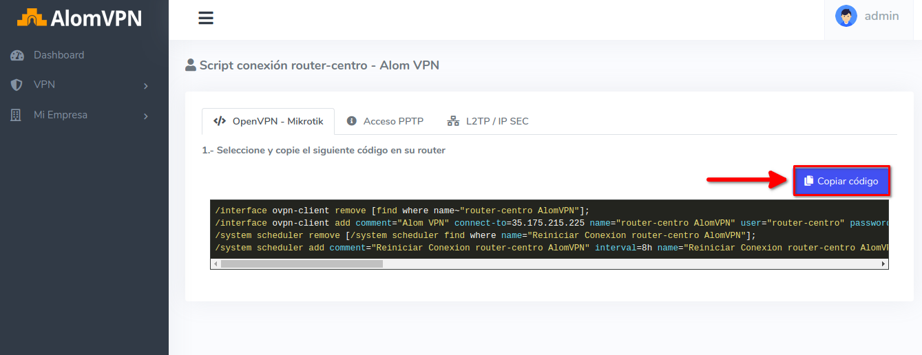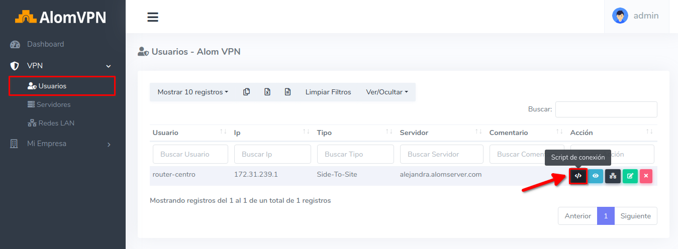 1 Ir a la sección de VPN que se encuentra en el menú de la izquierda y dar click a la opción de Usuarios, al ingresar listado de usuarios debemos dar click en el botón scrip de conexión del usuario que se creo anteriormente.