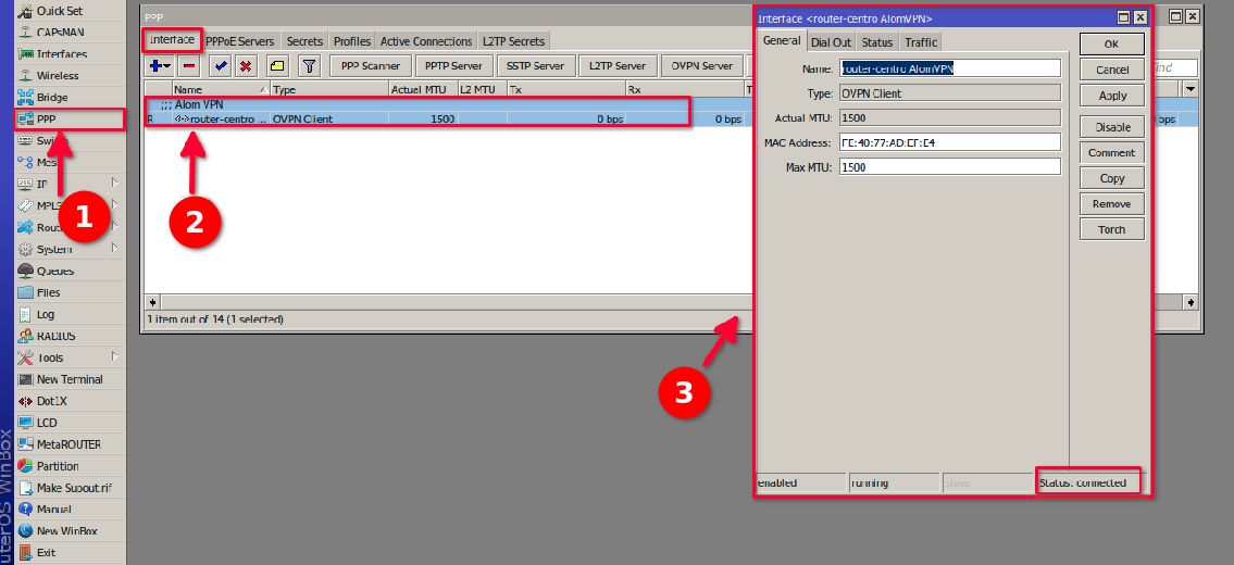 - Finalmente para comprobar que la nueva interface tiene conexión debemos dar click a la misma y abrirá una nueva ventana que en la parte inferior de esta nos mostrara el estatus de conexión, si estatus dice Connected quiere decir que todo salio correctamente.