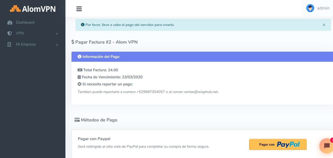 4 Será redirigido a la factura del servidor. El servicio de AlomVPN es prepago, por tal motivo debe realizar el pago de la factura para que su servidor pueda utilizarse.